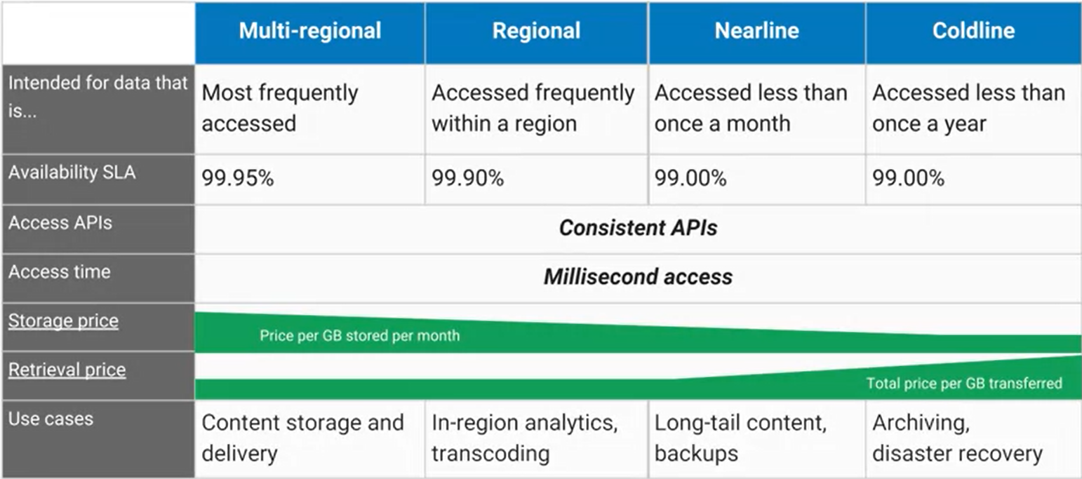 - Coldline Storage: 데이터 아카이빙을 위한 높은 내구성을 가지고있다. 매우 저렴하다. 온라인 백업 혹은 DR을 위한 스토리지이다. (일년에 한번 접근) 가용성이 낮다. (최소 보관기간 90일, 데이터를 엑세스할때 비용이 들고, 운영 비용이 높다)
