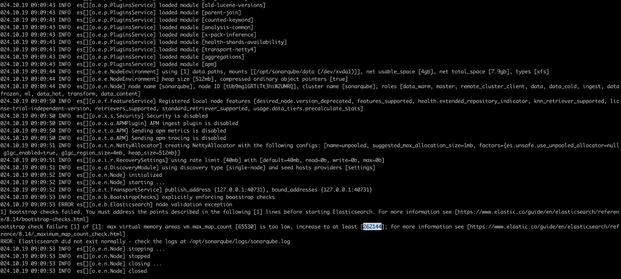 추가로, Elastisearch는 vm.max_map_count를 262144 이상을 사용할 수 있어야한다. 그렇지 않으면 sonarqube가 설치되었다 바로 내려가기 때문에 변경하여 설정하여야한다.