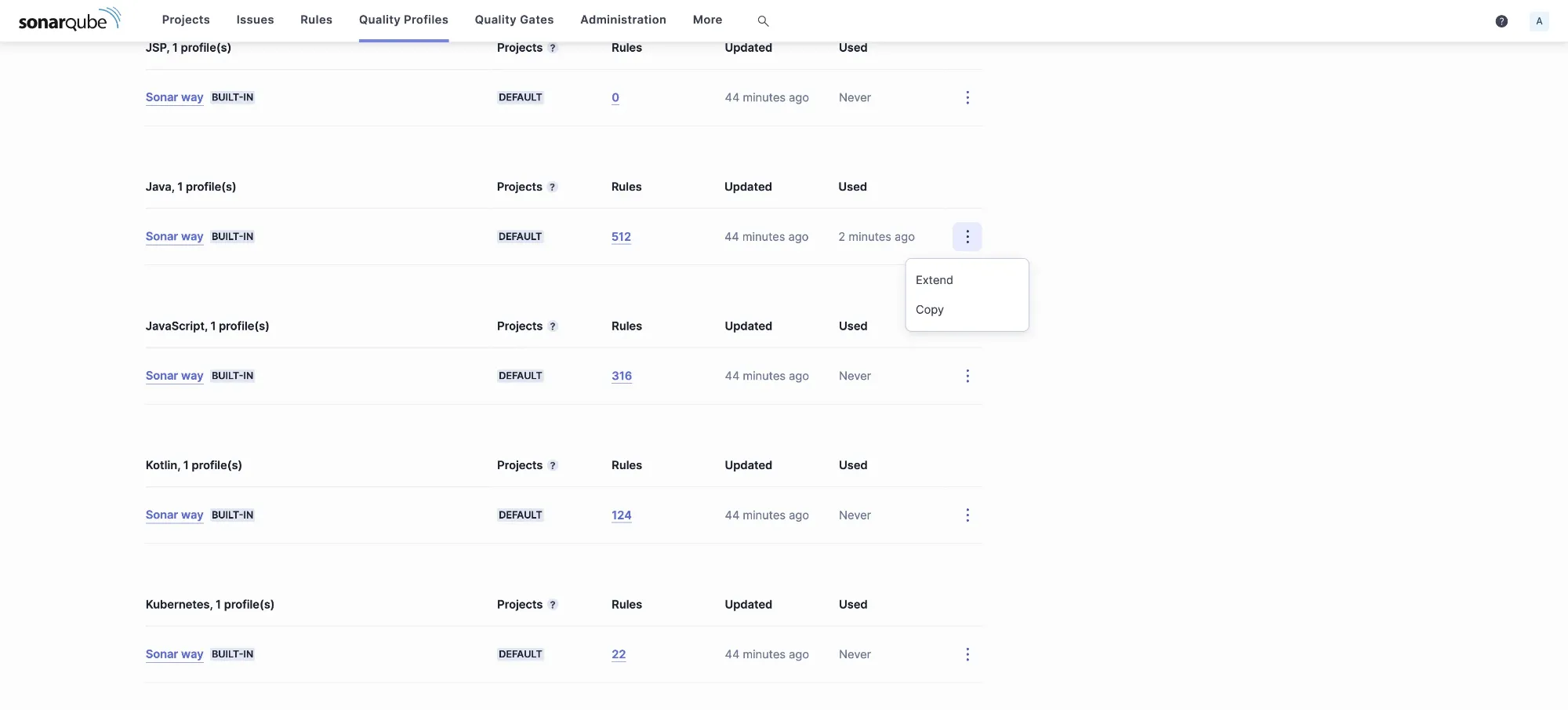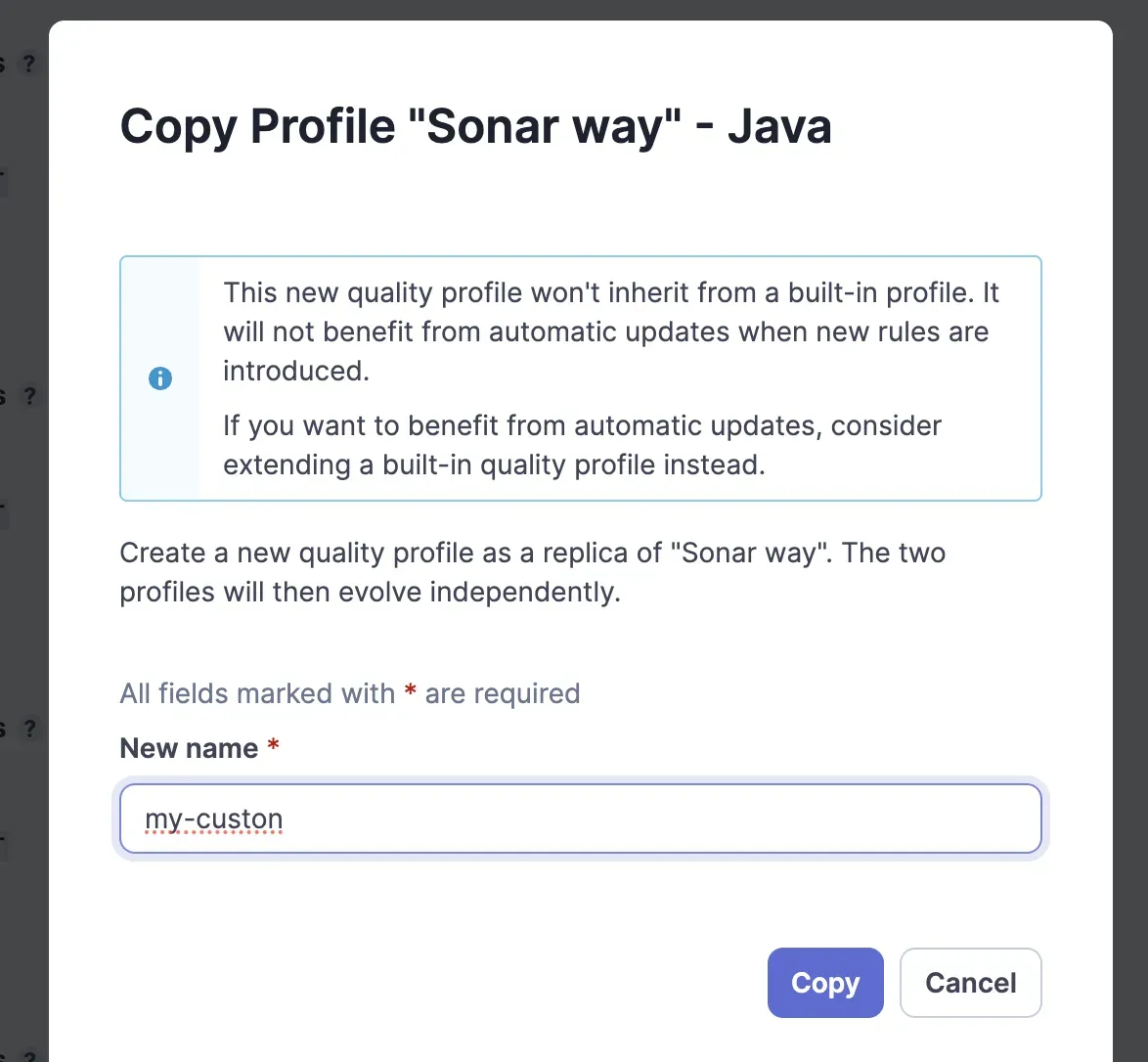 - 정적 테스트의 내용을 커스터마이징 하고싶다면, Quality Profile에 접근 후 profile copy를 먼저 진행한다.