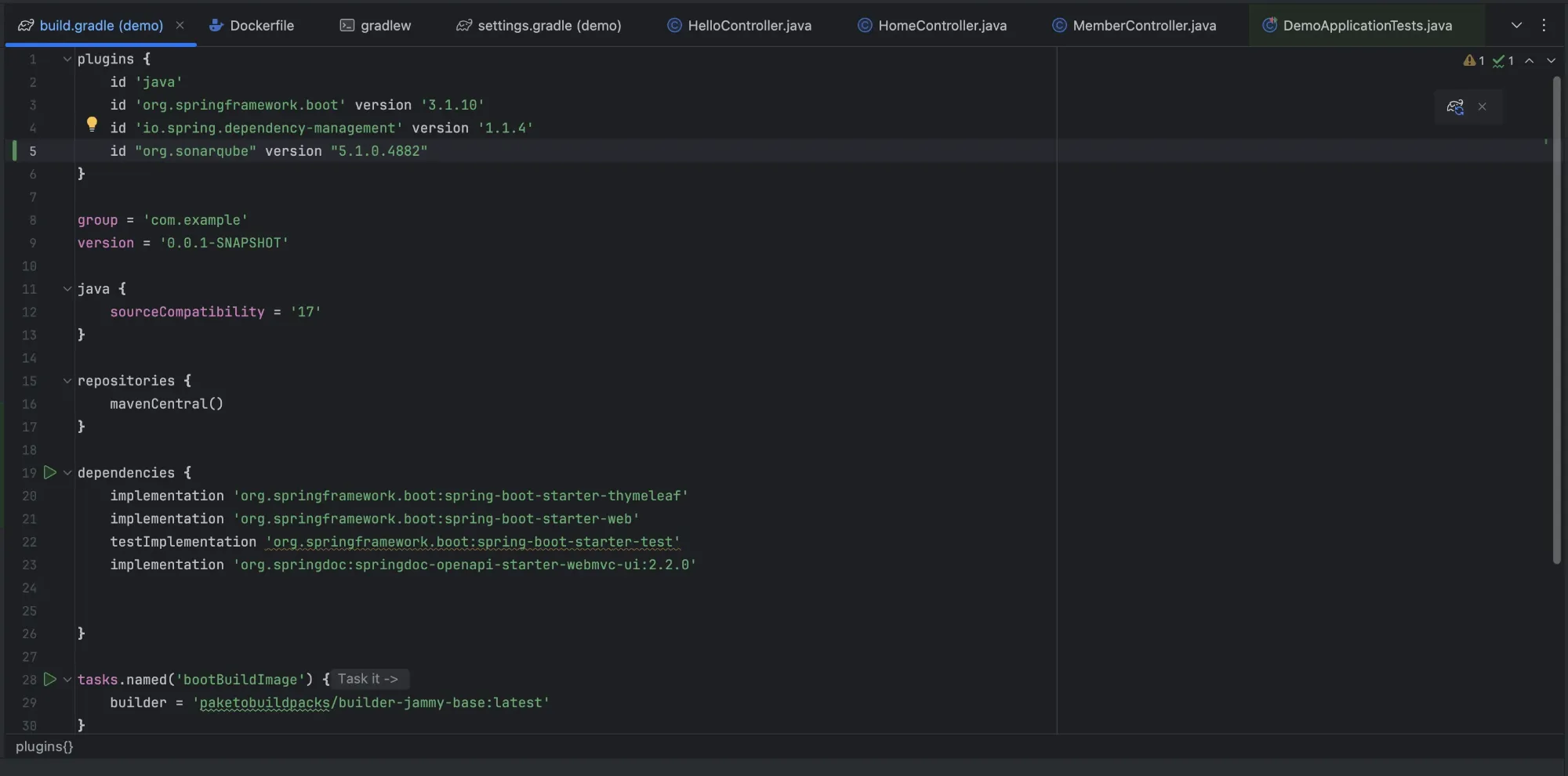 - gradle로 빌드하기 위해 build.gradle에 아래 플러그인을 추가해준다. (Spring Project 내 build.gradle)