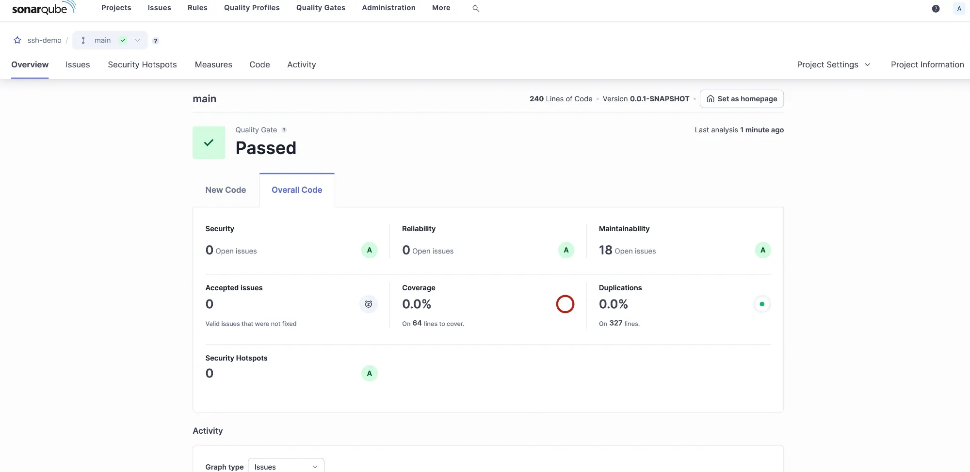 - 모두 수행이 완료되면 아래와 같이 정적 테스트가 완료된 화면이 나온다.