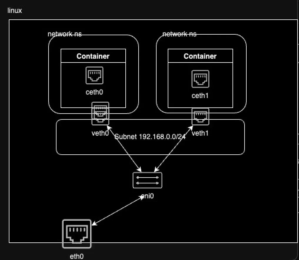 또한, linux에도 가상의 이더넷이 생긴다(veth0) 각각의 route table에 이더넷 정보를 매핑하게 되면, linux host 와 container 사이에 패킷이 소통할 수 있게 된다.