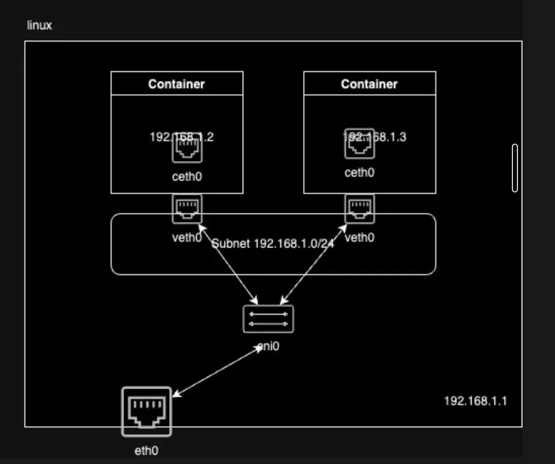 container ↔ container끼리는 이터넷 끼리 연결되어있지 않다. (Layer2) 그렇다면, Layer3(IP)를 이용해서 어떤 이더넷으로 가야할 지 설정이 필요하다.
