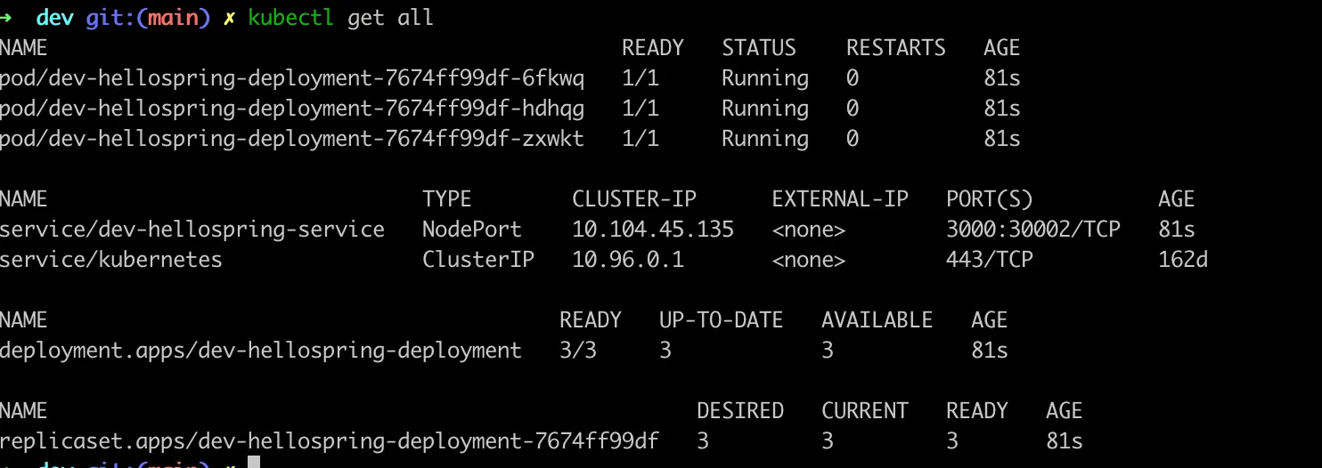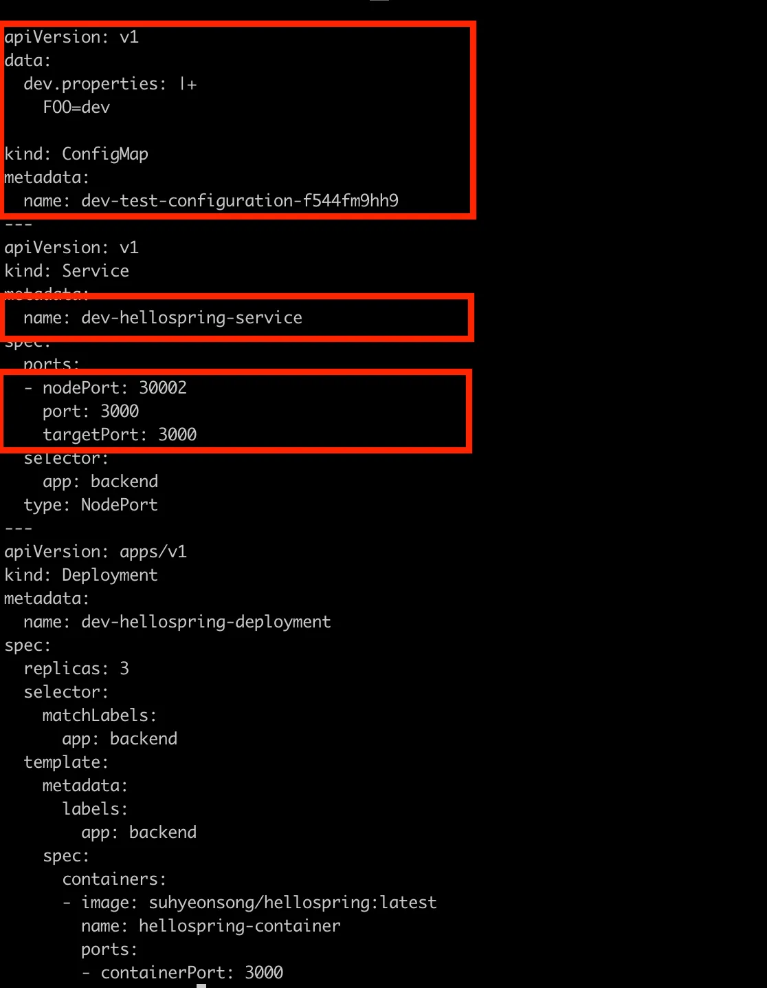 kubectl apply -k ./overlays/dev - 이제, base를 기반하여 dev환경에 맞춘 service 구성과, config파일을 overlay한다.