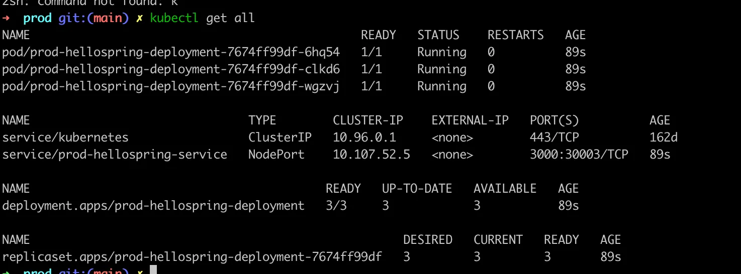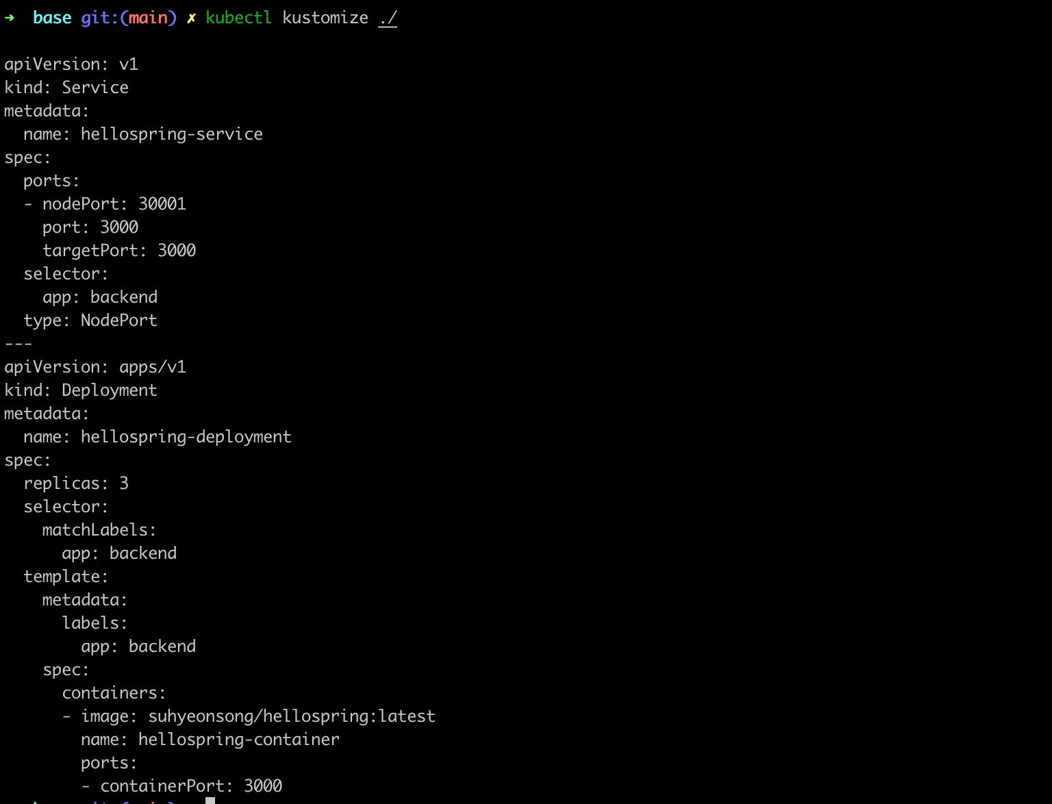 아래와 같이 kustomize파일에 넣은 service, deployment가 출력된다.