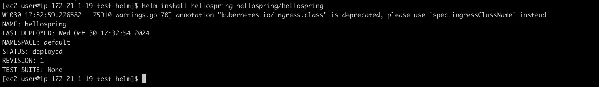 helm install hellospring hellospring/hellospring정상적으로 설치되었다.