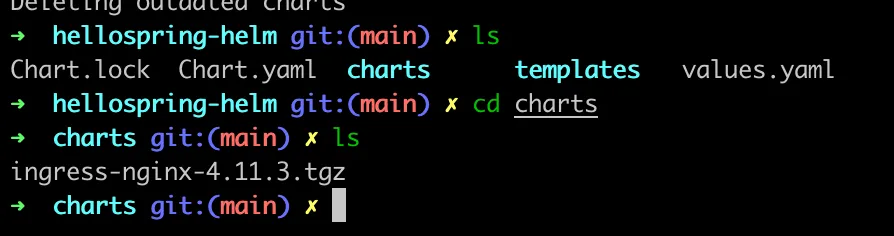 ingress가 종속성으로 있기 때문에, 아래 명령어로 charts/ 하위 디렉토리에 종속성을 다운한다.