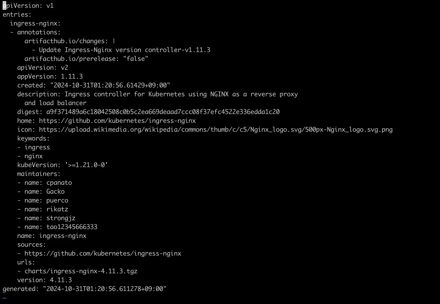 helm repo index . --url {{github pages 주소}}아래와 같이 파일 정보를 기반한 index가 생성된다.