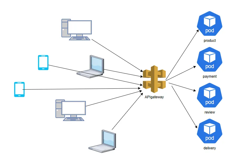 이러한 경우 관리의 어려움이 있을 수 있어, 다양한 Endpoint로 직접 호출하는 대신, 아래와 같이 APIgateway로 Endpoint를 추상화하는 것이 필요하다.