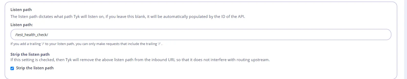 이 값은 고유한 값으로 설정되어야하고, gateway로 접근이 되면 이 listen path를 보고 proxy를 진행한다. 여기서는 /test_health_check/ 로 설정한다.