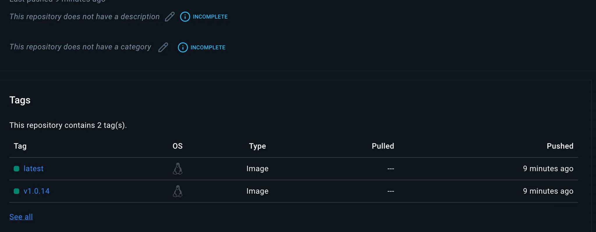 docker hub에 정상적으로 image가 push된 것을 확인할 수 있다.