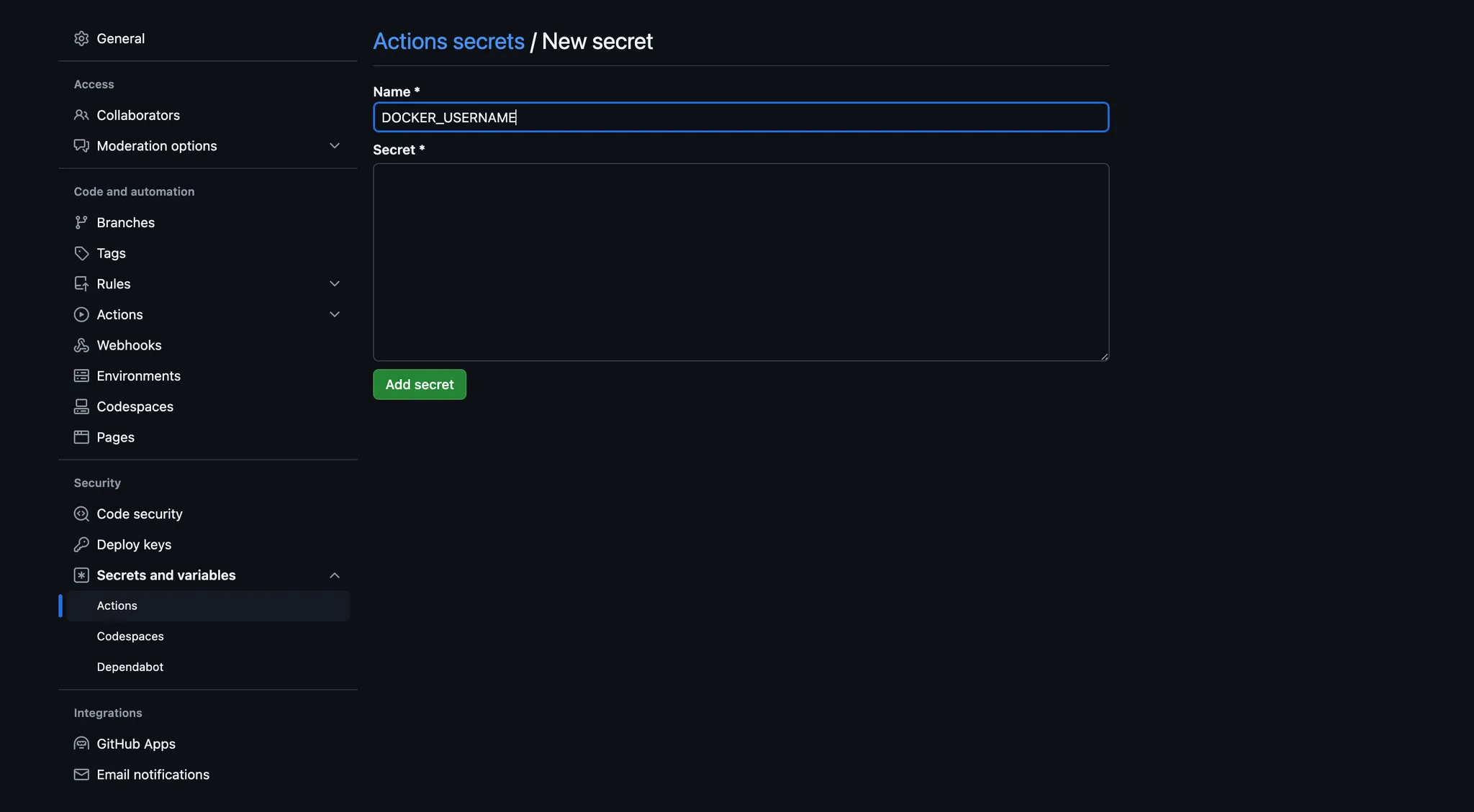 - git에서 보안을 위해서 민감 정보는 모두 secret로 관리하고 있는데, DOCKER_USERNAME, DOCKER_PASSWORD를 secret에서 참조하는 것을 볼 수 있다.