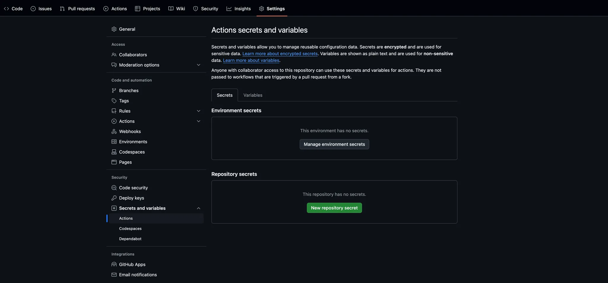 아래와 같이 setting - Secret and variables - Actions에서 설정해준다.