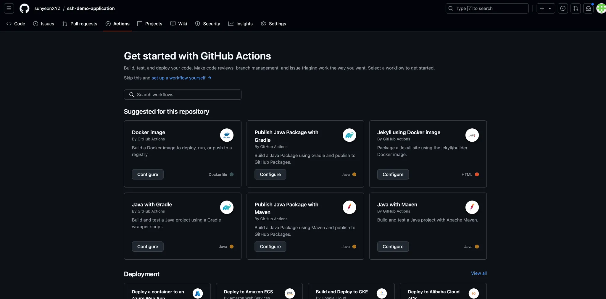 git 브라우저에서도 파일 생성이 가능하고, 경로는 리파지토리 내 .github/workflows/application-build.yml 에 생성된다.